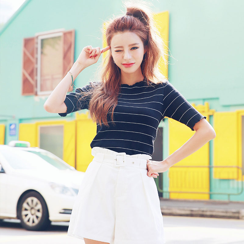 商品名称:韩都衣舍2017韩版女装夏装新款时尚修身显瘦圆领条纹T恤OGY7711娋 显瘦版型 舒适面料 条纹元素